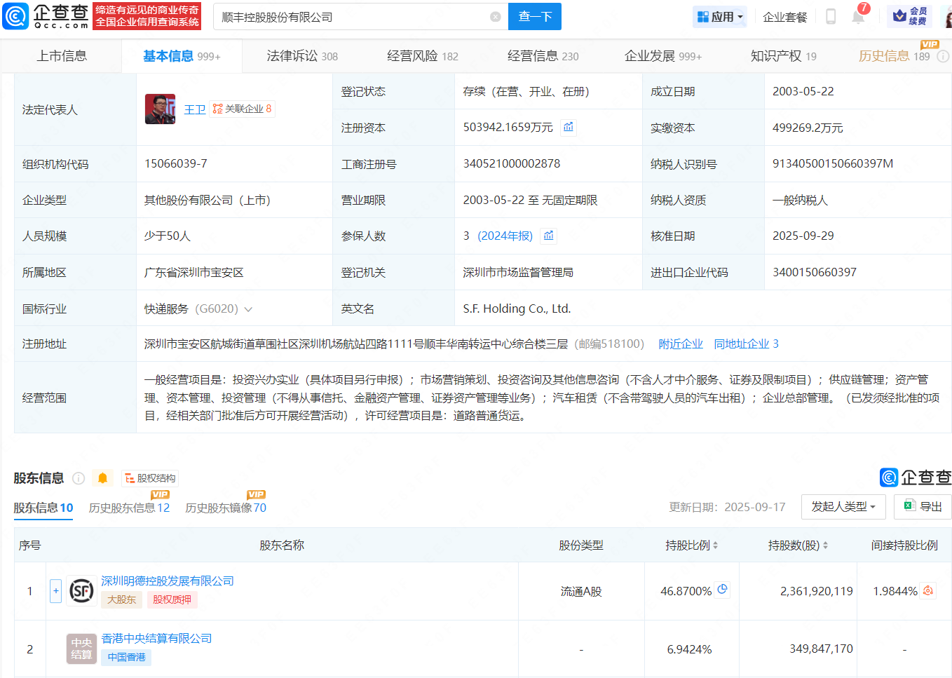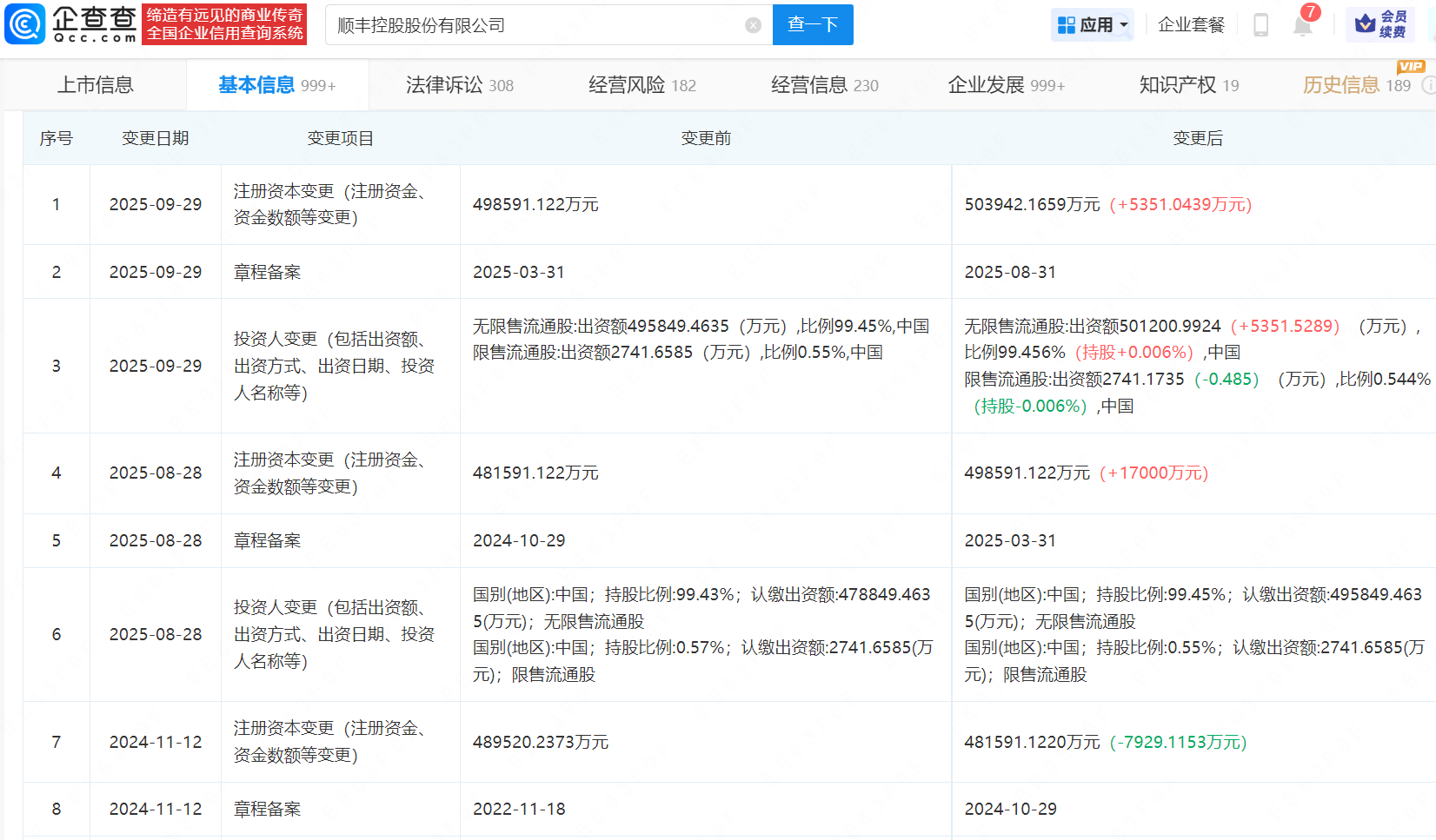 近日,顺丰控股(002352)发生工商变更,注册资本由约49.9亿元增至约50.4亿元。今年8月,该公司注册资本由约48.2亿人民币增至约49.9亿人民币。企查查信息显示,该公司成立于2003年5月,法定代表人为王卫,经营范围包含投资兴办实业,市场营销策划、投资咨询及其他信息咨询等,由深圳明德控股发展有限公司、香港中央结算有限公司等共同持股。
