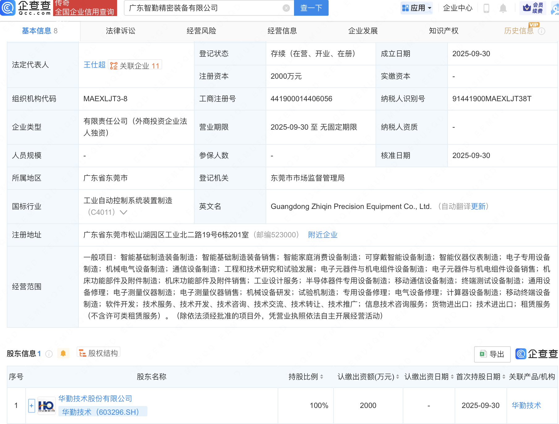 近日,广东智勤精密装备有限公司成立,注册资本2000万元,经营范围包含:半导体器件专用设备制造;移动通信设备制造;终端测试设备制造等。企查查股权穿透显示,该公司由华勤技术(603296)全资持股。